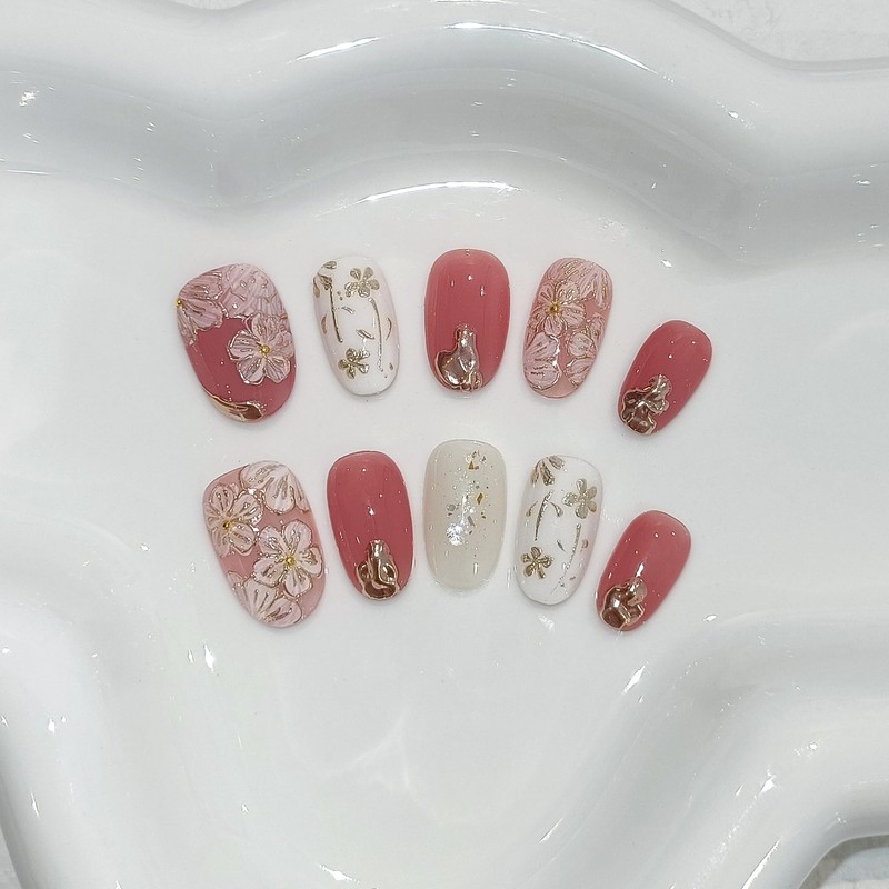 TENPAL Short Oval Press on Nails,Peach Yogurt Base Glue on Nails,Hand-Painted Cloisonné Florals False Nails Press ons,Artisan Chinese Style Fake Nails Kit,Enamel Wire Inlay Nail Art Tools 10pcs(XS)