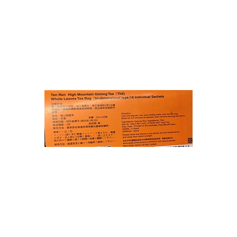 TenRen High Mountain Oolong Tea, Whole Leaves, 18 Tea Bags (Pack of 2)