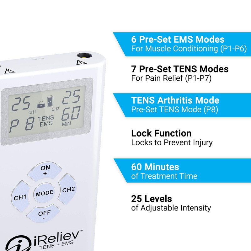 - FEATURES:The iReliev Strength & Recovery System Combines TENS & EMS: Features 8 Pre-Programmed Therapy TENS Modes and 6 EMS Modes Allowing you to Customize Your Therapy Based on Acute or Chronic Pain, Arthritis. Or EMS for Strength and/or Workout Recovery. Use P8 for Arthritis. RX Equivalent Output Intensity Offer 25 Levels.