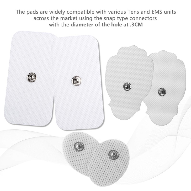 The pads are widely compatible with various Tens and EMS units across the market using the snap type connectors with the diameter of the hole at .3CM.