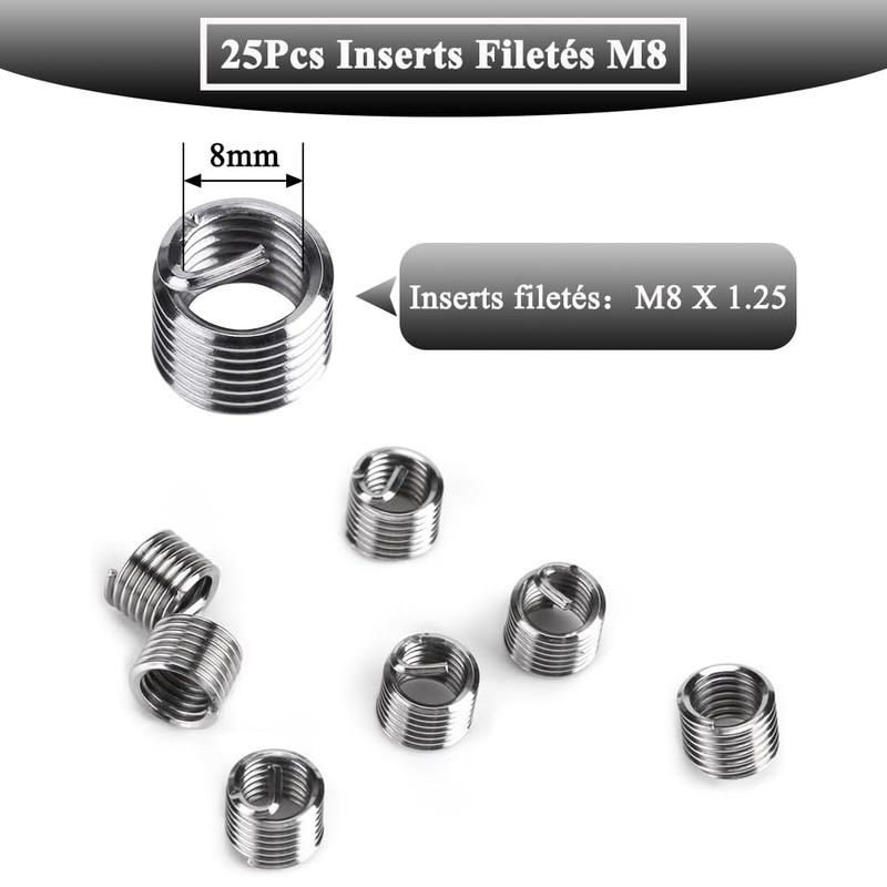 - Packaging: a 30 piece thread repair kit. Consists of 25 threaded inserts, a drill, a tap, an adjustable wrench, a mounting tool and a tool for breaking cable lugs.