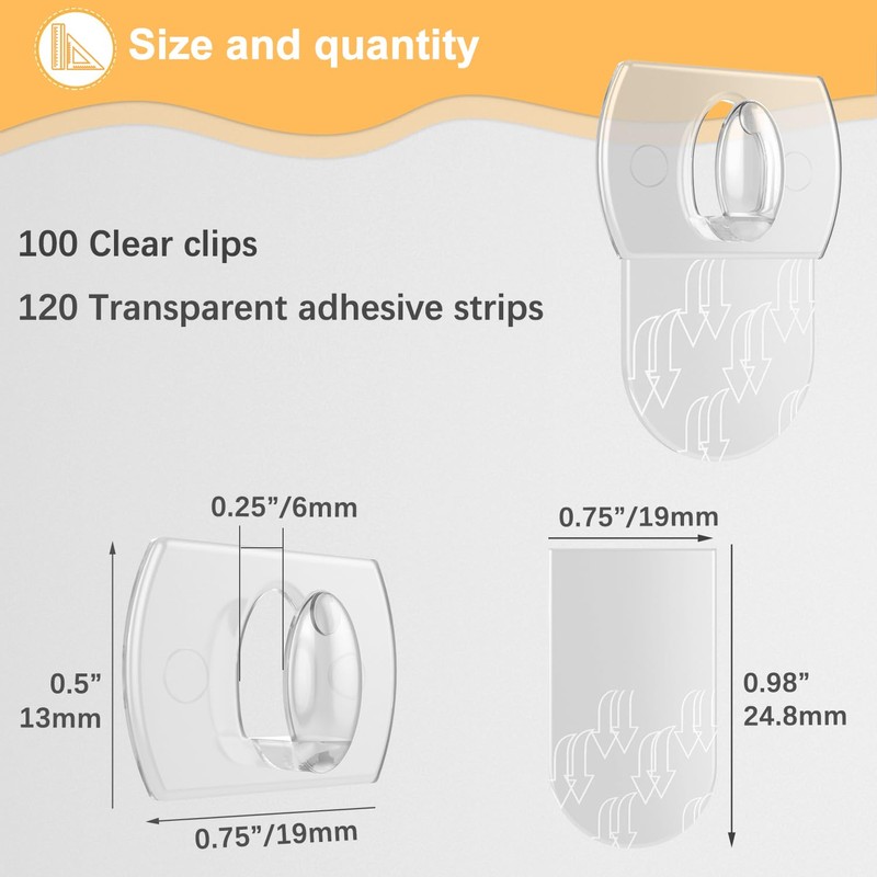 TEOYNGU 100 Clips + 120 Adhesive Strips, Command Clear Mini Light Clips, Command strips hooks, Small Self-Adhesive Hooks, Indoor Christmas/Festival Decoration,Command hooks small