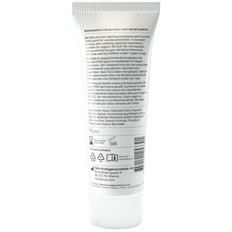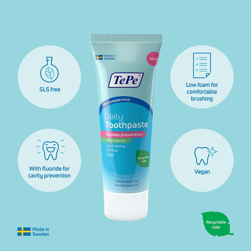 • Swedish recipe: The TePe Daily Toothpaste is made with a few and particularly carefully selected ingredients. Made in Sweden in collaboration with dental experts. The TePe Daily Toothpaste range is available in three varieties: adults, kids, and babies.