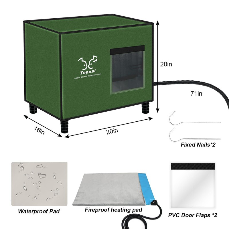- Highly Insulated & rainproof - Crafted with layers of high-quality Isolation and waterproofing, Plus a high-power pet heating padthe Tepoal heated cat shelter keeps outdoor animals warm and cozy even when temperatures dip below C. The cat house effectively blocks cold air and retains warmth inside