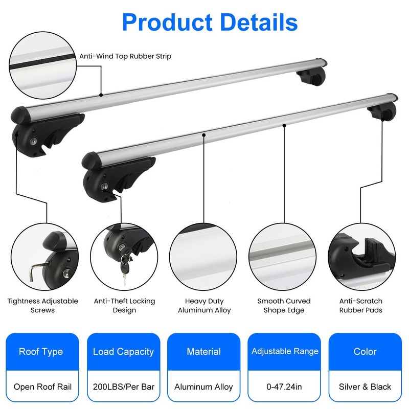 • Made from high-strength aluminum alloy materials, our cross bar can withstand severe weather and can bear up to 176lbs in total. At the ends of the cross bar adopt smooth curved shape design and added rubber strips to effectively decrease wind noise and resistance. And each across bar comes with an anti-theft lock to ensure the security of the cross bar. Additionally, it can be easily mounted on most vehicles easily and quickly to carry bike, kayak racks, cargo frame, cargo boxes, snowboard, surfboard, etc.. Perfectly fit most cars, Vehicles and SUVs with existing raised side rails with gap, whose distance from outer side to outer side is no more than 44.1in, and thickness is less than 1.97in.