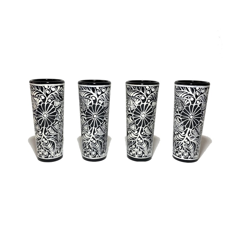 - The bottle and the shot glasses are made out glass and the skull is made out of clay.