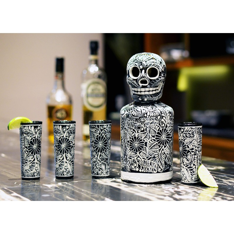 - The set includes the decanter with the skull and the sombrero. Along with 4 shot glasses