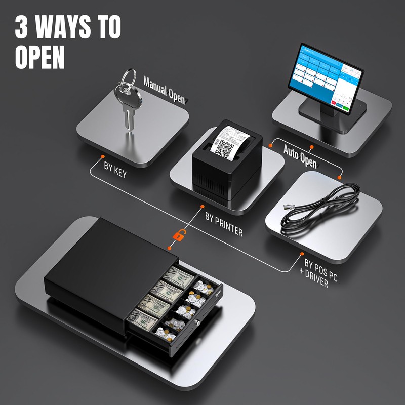 - ENHANCED SECURITY WITH 3-POSITION LOCK: Features a 3-position key lock for versatile use: 1-Automatic open via printer or driver, 2-Manual open with key, and 3-Locked position for added security. This smart locking mechanism ensures controlled access and keeps your cash safe during operation, making it an ideal choice for businesses.
