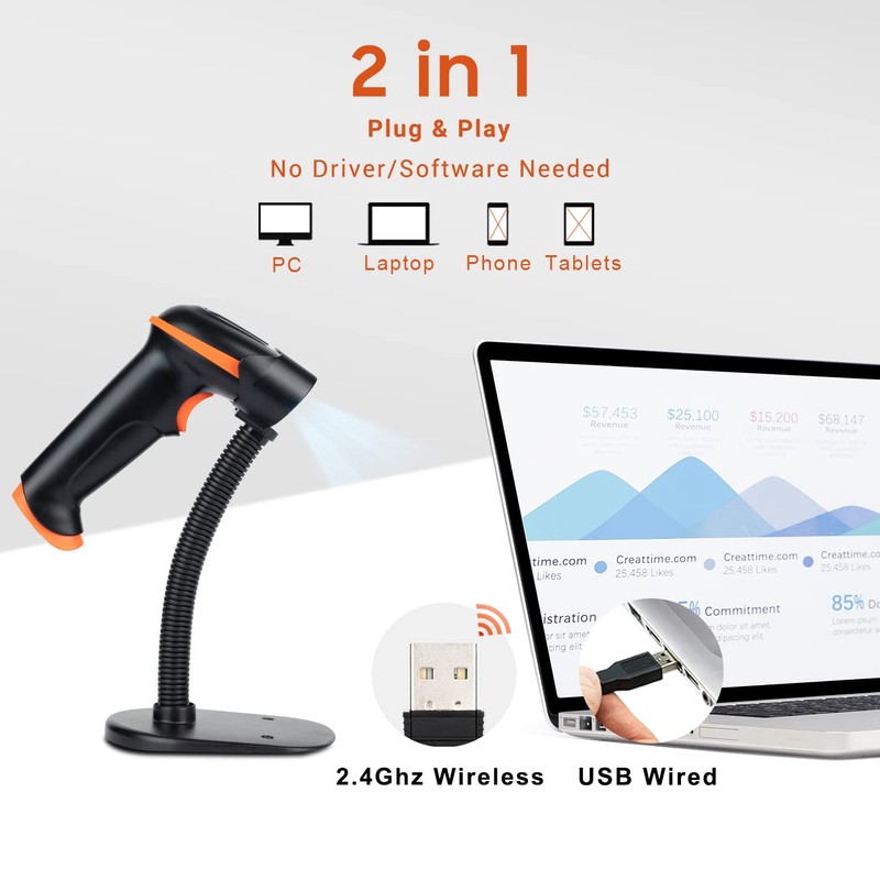 - 【Anti-Shock Silicone&Stand】The orange anti-shock silicone protective cover can avoid scratches and friction while falling from the height of 6.56 feet. IP54 technology protects the wireless barcode scanner from dust. The supporting bracket can free your hands and make it more convenient to use. 【Package Includes】Barcode Scanner x1, Barcode Scanner Stand x1, USB Cable x1, Dongle x1, User Manual x1.