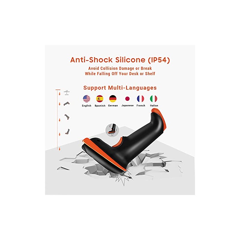 - 【Anti-Shock Silicone】 The orange anti-shock silicone protective cover can avoid scratches and friction while falling from the height of 6.56 feet. IP54 technology protects the wireless barcode scanner from dust.