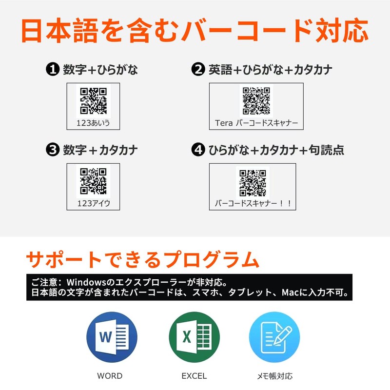- (Code Contents Including Japanese Characters) The code contents including Japanese letters can be successfully output to EXCEL, word, notepad, etc. Note: 1. When entering a barcode containing Japanese, please scan the setting code on the 09th page of the instruction manual first. 2. If you cannot enter a Japanese barcode correctly on Windows 10/Windows 11, please set the computer version to the previous version of Microsoft IME. Note: ]