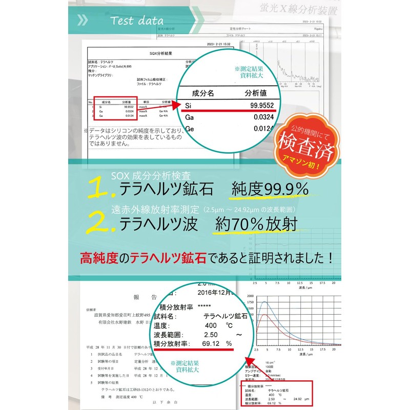 - (Regarding Public Inspections, Purity, and Radiation Rate) The popular terahertz mineral is also available in fake and low quality terahertz mineral that has been coated with hematite on the stomach. Our shop has undergone numerous checks by public institutions to ensure authenticity. Firstly about the purity of terahertz mineral is not hematite imitation imitated, but it is about 99% high purity and high quality terahertz mineral Other stores describe 100% silicon but please note that the number 100% without the inspection table is only for simple inspection. In addition, it has been tested to emission radiation rate of terahertz waves, and it records a high emission rate of approximately 70%. We want you to wear genuine high quality terahertz mineral with peace of mind