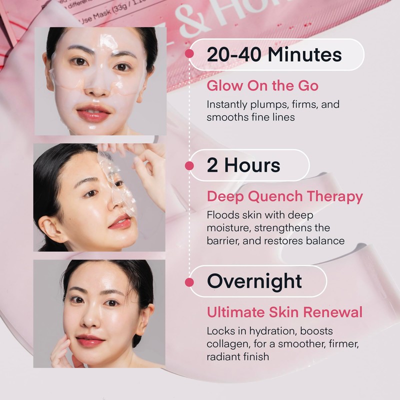 - Three Ways to Glow: 1. Instantly hydrate in 20-40 min; 2. Deeply nourish in 2 hours as the mask turns transparent; 3. Wear overnight to lock in moisture, boost collagen, and wake up to a firm, glass-skin glow.