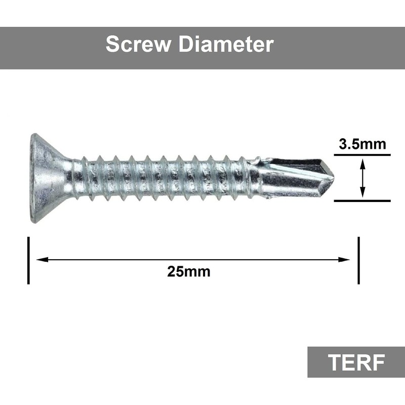 TERF® Self Drilling Countersunk Screws 3.5 X 25mm Self Tapping Phillips Drive Screw for Plasterboard Wood Metal Sheet Steel Sheet Roofing Window - Pack of 100