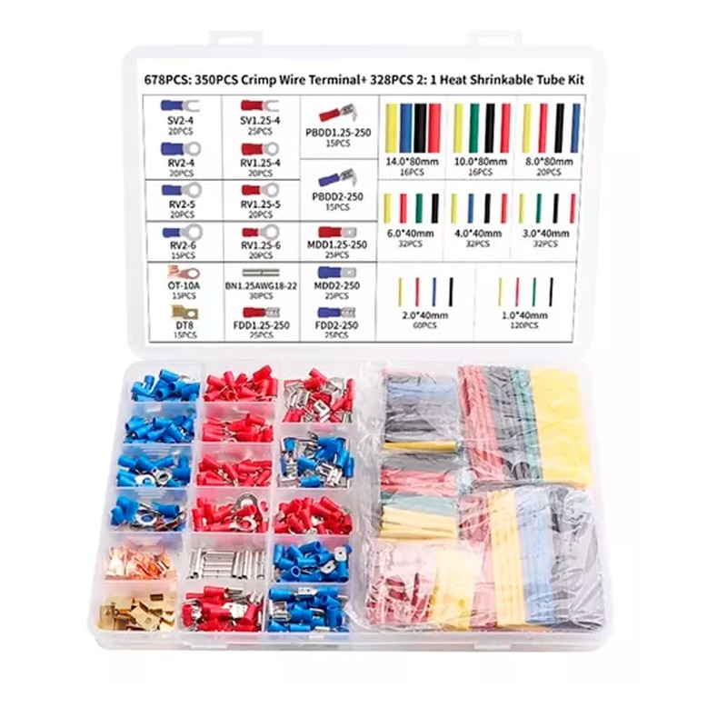- 🧰PAQUETE DE GRAN VALOR:El Kit de Conector Eléctrico Tiene 678 Piezas, 350 Piezas de 17 Tipos de Terminales de Cable en Tres Colores y 328 Piezas de Tubos Termorretráctiles 2: 1. Encontrará el Conector y La Tubería Adecuados para Casi Todos Los Proyectos de Cableado Eléctrico.