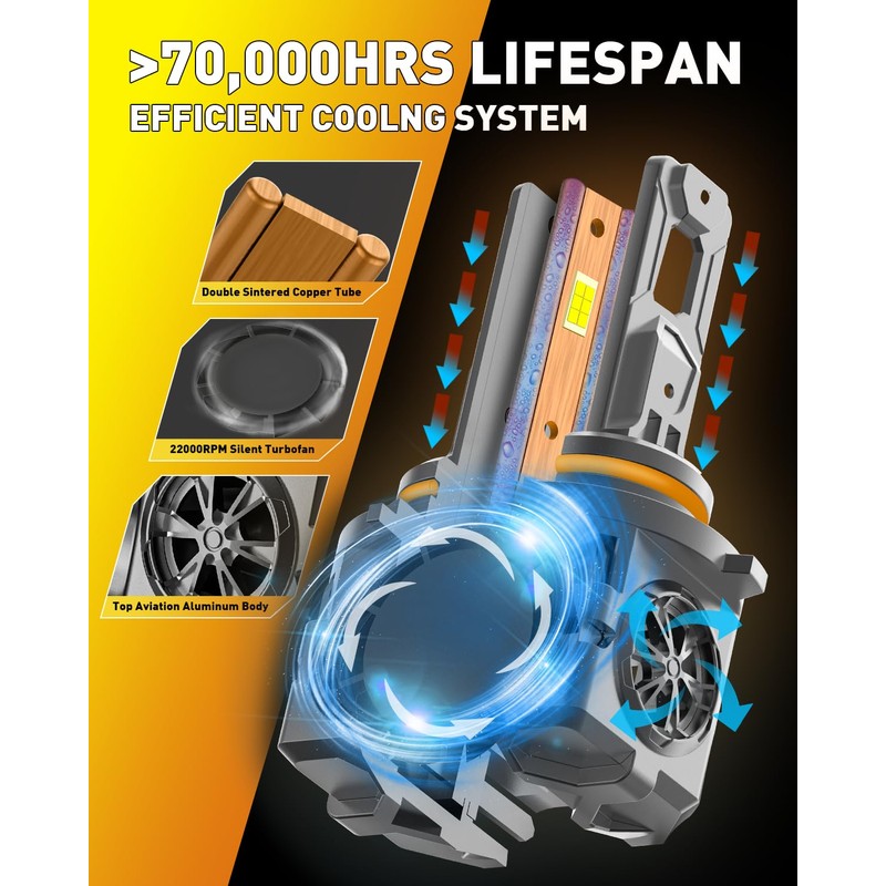 - 【Unrivaled Power and Performance】Crafted with precision from premium aviation-grade aluminum, complemented by a thermostatic copper plate and a high-speed 20,000RPM cooling fan, our bulbs feature an unparalleled cooling system. This ensures swift heat dissipation, maintaining stable and uninterrupted operation. With an extended average lifespan of 60,000 hours per light, you can count on reliable performance mile after mile.