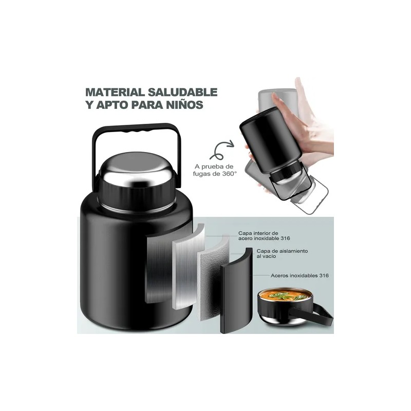 1. Fiambrera de acero inoxidable con aislamiento al vacío que mantiene la comida caliente de 8 a 12 horas.
