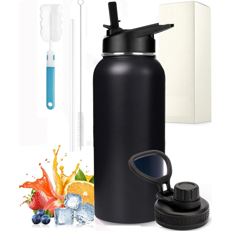 Termo,Termo de Acero Inoxidable,Botella Térmica(1200ML), Termo de Agua con 2 Tapas,Sin BPA,Agua Fría (24 horas) o Caliente (12 horas), Doble Pared de Aislamiento al Vacío (Negro)