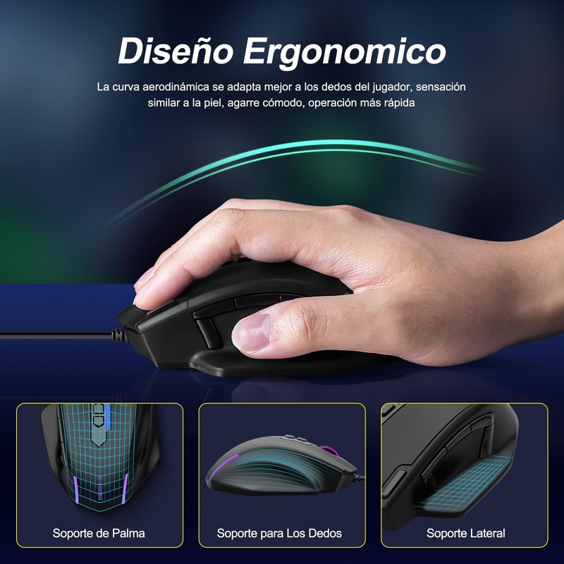 - Amplia Compatibilidad con Mouse Ergonómico: El cuerpo del mouse gamer está diseñado con alta ergonomía para un uso más cómodo. Además, cuenta con una superficie texturizada antideslizante que evita el sudor de las manos, para sesiones prolongadas sin molestias. Este mouse para juegos es perfectamente compatible con Windows 2000 / XP / VISTA / 7/8 / 10, Mac y otros sistemas.