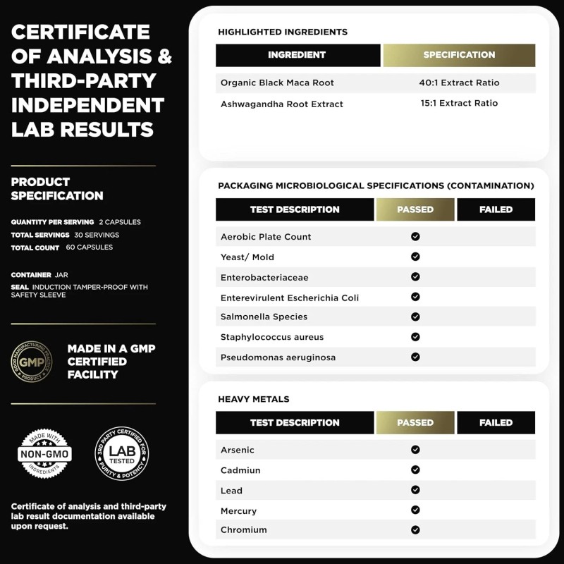 An ultra potent & highly concentrated formula consisting of 40x concentrated Organic Black Maca Extract plus 15x concentrated Ashwagandha Root Extract, enhanced with BioPerine (organic black pepper extract) to maximize absorption & results.*