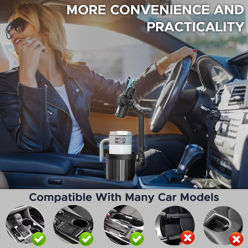 - [2-in-1 Car Cup Holder Expander & Phone Holder] This innovative car phone holder combines a cell phone holder and a secure car cup holder in one compact design. It expands your cup holder to fit cups up to 4.1 inches in diameter, accommodating nearly all tumblers, water bottles, and travel mugs. Unlike traditional mounts that take up cup space, this 2-in-1 design maximizes space efficiency, keeping your drinks and phone within easy reach for a safer and more organized driving experience.