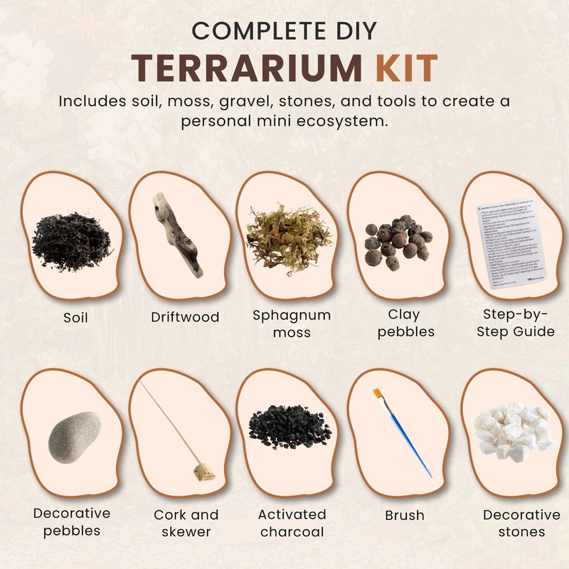 - Create a lush eco indoor mini garden with our easy to assemble terrarium kit with the STEP BY STEP GUIDE provided. Fantastic gift for a creative green fingered friend, and/or family who loves a bit of enjoyable indoor DIY planting. Choose the size of terrarium kit you require in the menu and we shall get it to you in no time. To finish off, all you need is a vessel of your choice and a creative mind.