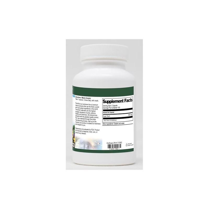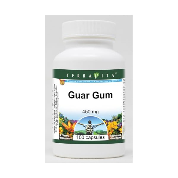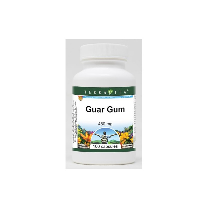 Guar Gum - 450 mg (100 capsules, ZIN: 513562)Packaged in the United States in a GMP certified facility (Good Manufacturing Practice).No fillers.Manufacturer: TerraVitaSize: 100 capsulesEasy-to-swallow Capsules in a sealed bottle.Ingredients: Gelatin, Water, Guar Gum - 450 mg