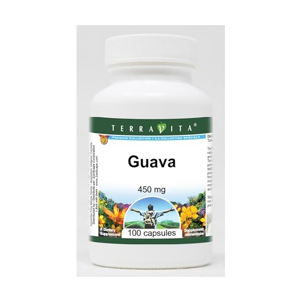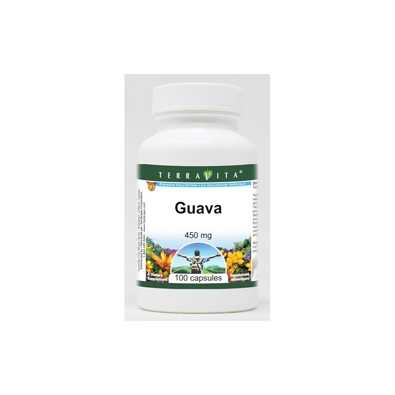Guava - 450 mg (100 capsules, ZIN: 520402)Packaged in the United States in a GMP certified facility (Good Manufacturing Practice).No fillers.Manufacturer: TerraVitaSize: 100 capsulesEasy-to-swallow Capsules in a sealed bottle.Ingredients: Gelatin, Water, Guava - 450 mg