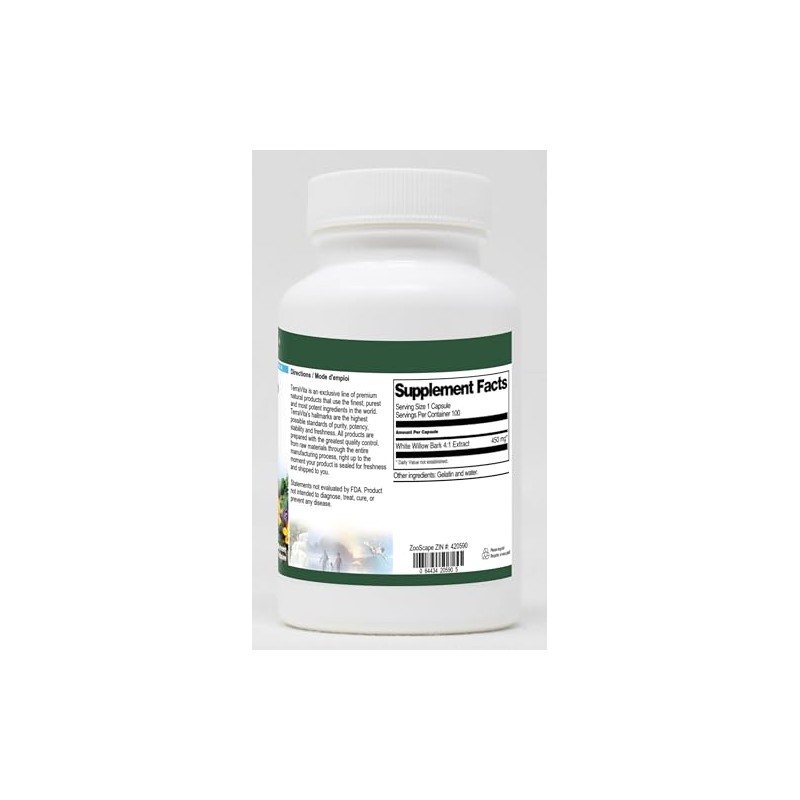 White Willow Bark 4:1 Extract - 450 mg (100 capsules, ZIN: 420590)Packaged in the United States in a cGMP certified facility (current Good Manufacturing Practice).No fillers.Manufacturer: TerraVitaSize: 100 capsulesEasy-to-swallow Capsules in a sealed bottle.Ingredients: White Willow Bark 4:1 Extract - 450 mg, Gelatin, Water