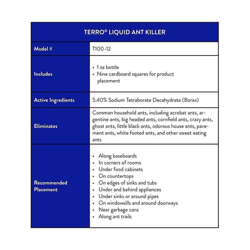 To kill common household ants, simply place TERRO Liquid Ant Baits stations near indoor areas where ants are spotted. Ants enter the trap, consume the liquid ant bait and return to the nest where they pass on the bait to the rest of the colony. TERRO Liquid Ant Baits are specifically formulated to allow worker ants to consume the product and survive long enough to carry the liquid back to the nest and deliver a dose to the rest of the colony . The liquid ant bait stations prevent the bait from drying out and provide the ants with a continuous supply of liquid, day and night. Monitor the baits regularly for activity, but do not interfere with the ants or baits. Replace with additional baits when the first set is depleted. Depending on the size of the ant infestation, complete control may take up to two weeks.