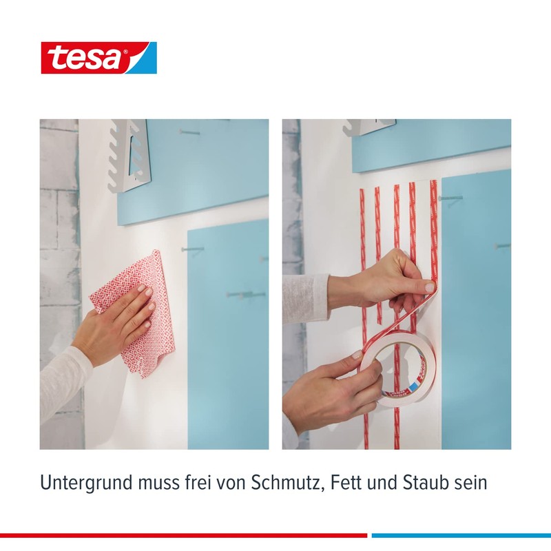 - The double-sided adhesive tape is the clever alternative to drilling and hammering thanks to reliable adhesion, without any damage or holes in the surface.
