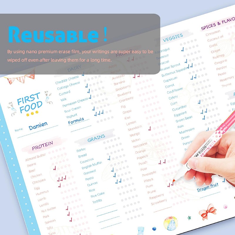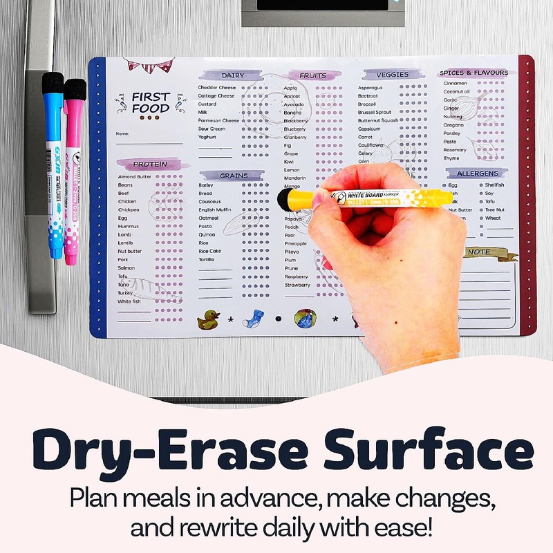 • 100% ERASABLE: baby first food tracker made with PET nano premium erase film, our magnet allows for easy wiping off of writings, even after extended periods. first foods chart is reusable, making it a practical choice for busy parents.