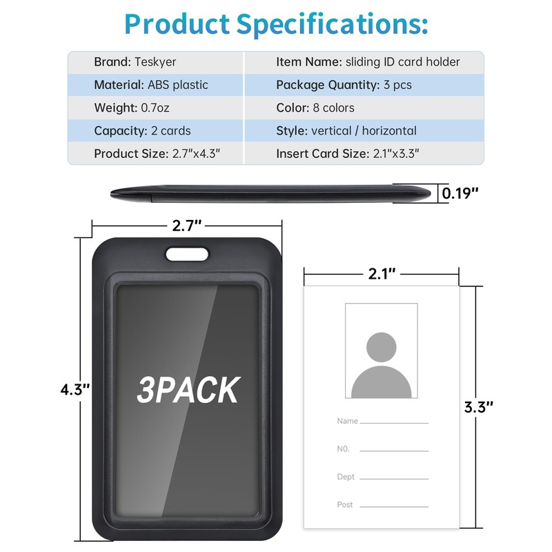 - Insert size: 3.34" x 2.12", can hold 2 pcs of credit card similar sized id badges; Package quantity: 3 pack