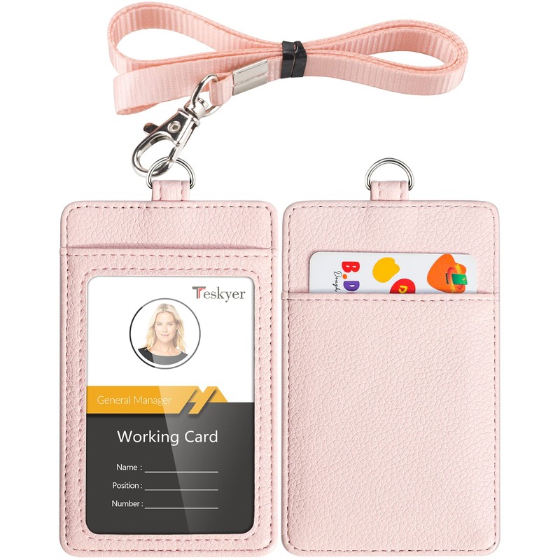 Teskyer ID Card Holder with Strap, PU Leather with Transparent Window and 2 Cards and Nylon Lanyard, Light Pink