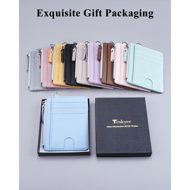 Teskyer Slim Minimalist Wallet, RFID Blocking Credit Card Holder Leather Wallet with Zipper Pocket for Men Women - Lichee Cyan