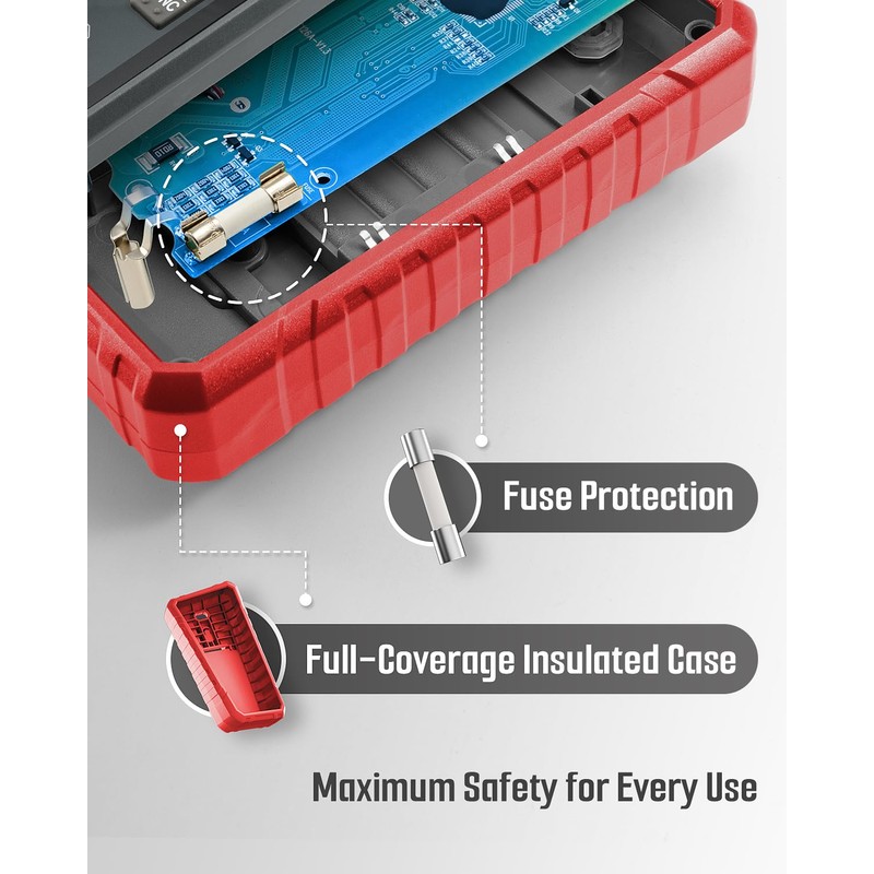 Equipped with a 10A/250V fuse, this voltage meter effectively prevents current measurement overload and protects both the device and the user, while its insulated silicone casing enhances safety.