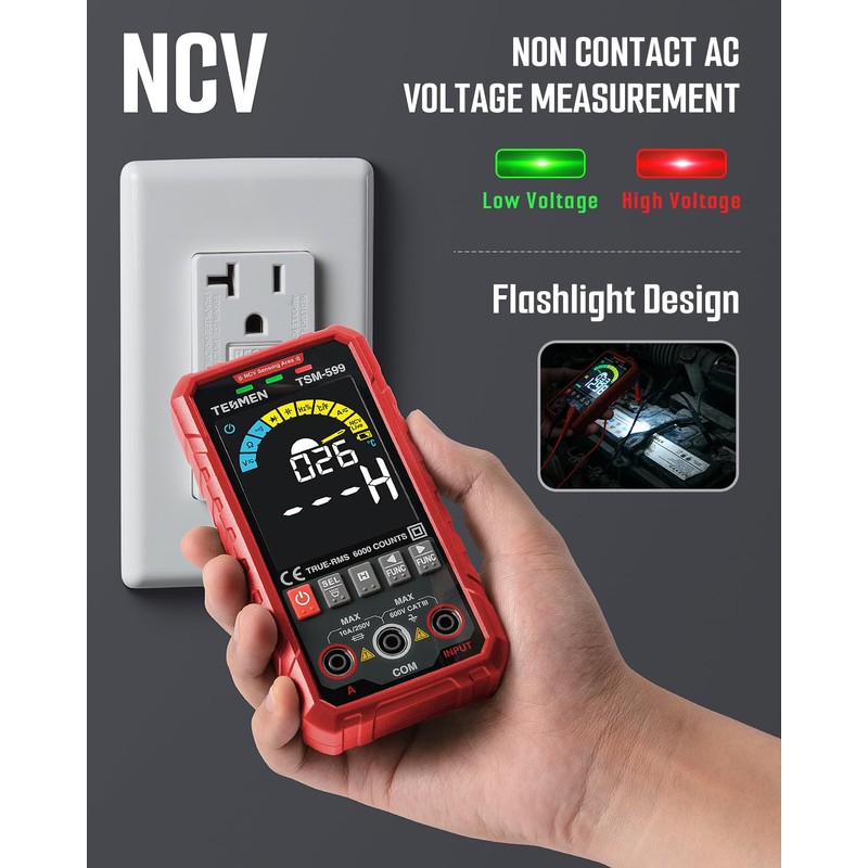 TESMEN TSM-599 Smart Digital Multimeter, Auto&Manual Measurement, TRMS 6000 Counts, Voltmeter with NCV, Voltage&Current, Resistance, Continuity, Diode, Capacitance, Hz%, Temperature, Live Wire - Red