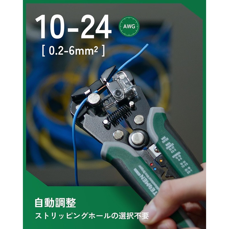 This wire stripper automatically adjusts to wires ranging from 0.2 to 6mm², eliminating the need for manual hole selection. The adjustable stopper controls the stripping length, while the thumbwheel tensioner ensures precise stripping for thinner wires. Compatible with NMB cables, Ethernet cables, solid wires, stranded wires, outer sheaths, and multi-core cables.