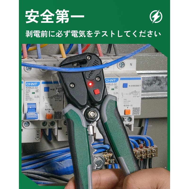 The TESMEN TWS-322 is equipped with a highly reliable non-contact voltage detection feature. When AC voltage is detected, an alarm sound and a red indicator light activate, allowing you to quickly check for live circuits before stripping wires. Voltage detection range: 70-250V.