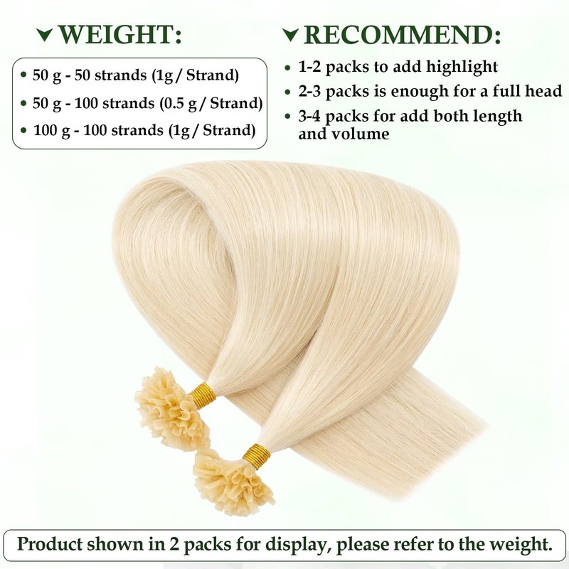 - Seamless and professional: the human hair bonding extensions are available in lengths from 40 cm to 60 cm. Total hair weight 50g, 50 strands (1g/s) in one pack. The hair extensions provide a natural, invisible finish, perfect for hair thickening and extensions. Usually 2-3 packs are recommended for a full head.