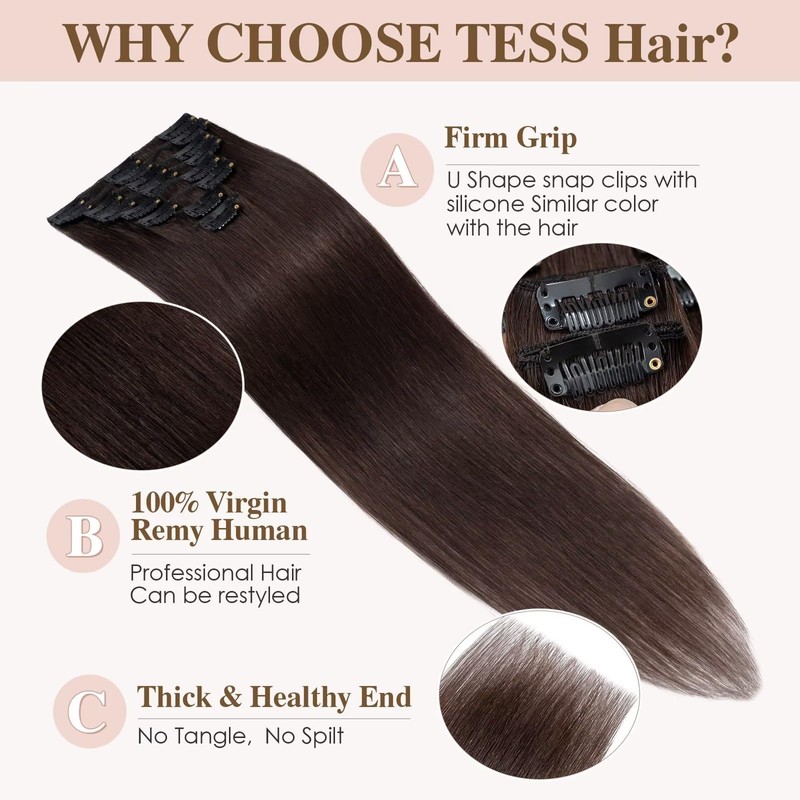 Tess Clip-In Real Hair Extensions, Remy Human Hair Extensions, 18 Clips, 8 Wefts, Long & Straight, 45 cm, 70 g, #2 Dark Brown