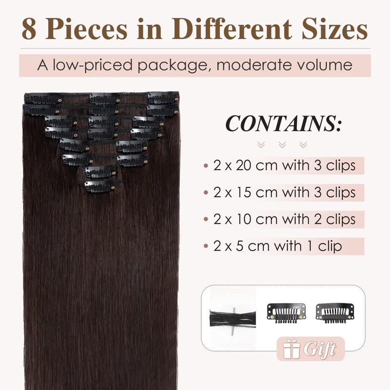 - Dark brown clip-in real hair extensions: Length: 45 cm. Weight: 70 g. Hair thickness depends on hair weight: the heavier it is, the thicker. 1 pack is thin. If you have medium or thick hair, we recommend 2-3 packs or try a double weft.