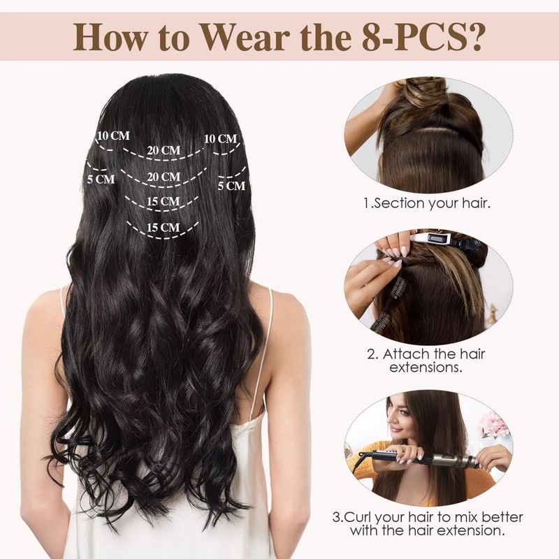 - 8 weft clip-in hair extensions add length and volume in 5 minutes without damaging your hair from glue or tapes.