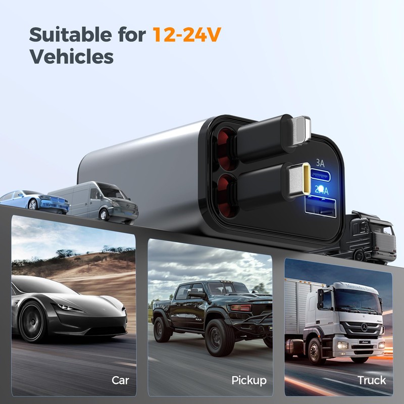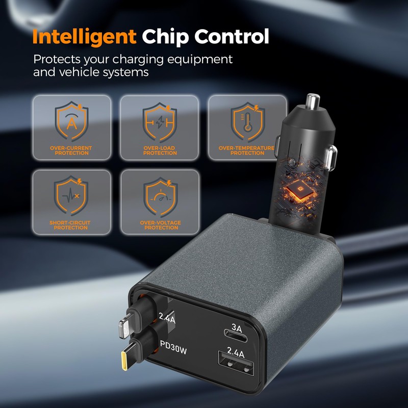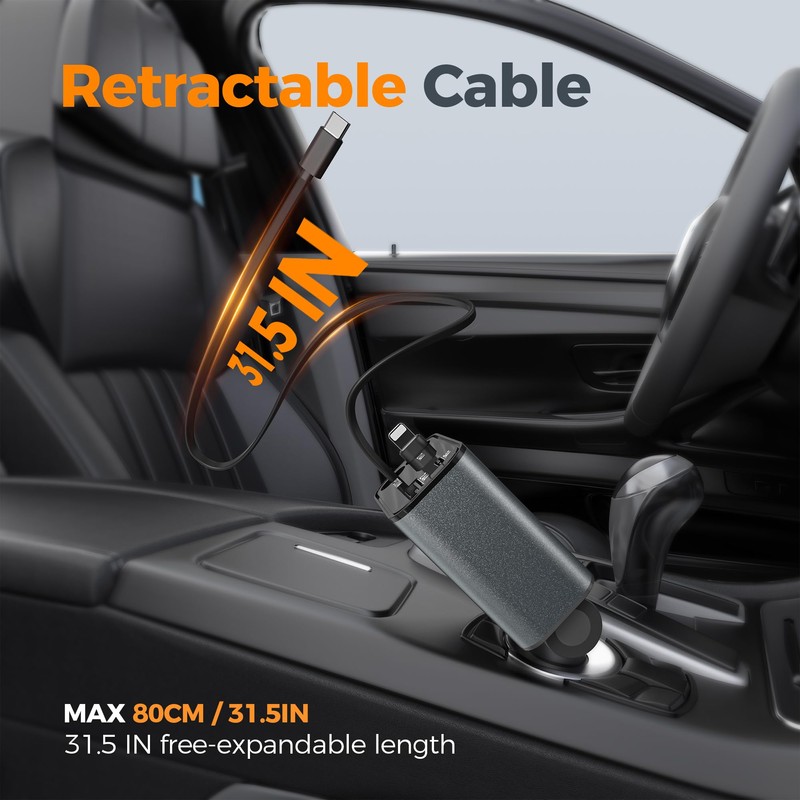 - 【Upgraded 4-in-1 Fast Charging Solution】El cargador de coche TESSAN viene con un verdadero cable retráctil Tipo-C de carga rápida PD 30W, un cable retráctil IOS de carga rápida de 18W y puertos USB-C y USB-A adicionales para cargar rápidamente hasta cuatro dispositivos simultáneamente. No necesitas varios cargadores, solo un dispositivo compacto para todas tus necesidades de carga