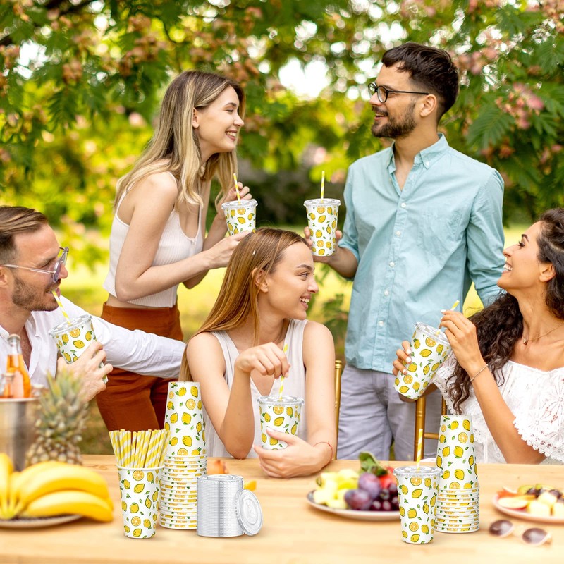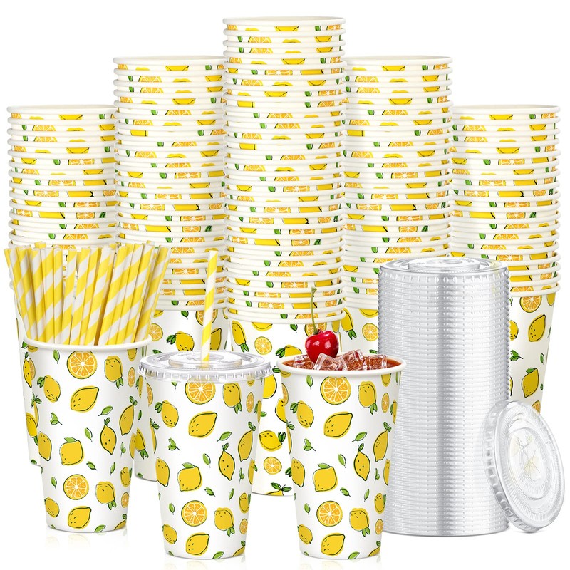 Tessco for you Tessco 150 Pieces/50 Sets Lemonade Cups with Lids and Paper Straws 16oz Disposable Iced Coffee Paper Cup Summer Citrus Cold Lemonade Stand Supplies for Fruit Party Beverages Drinks Juices