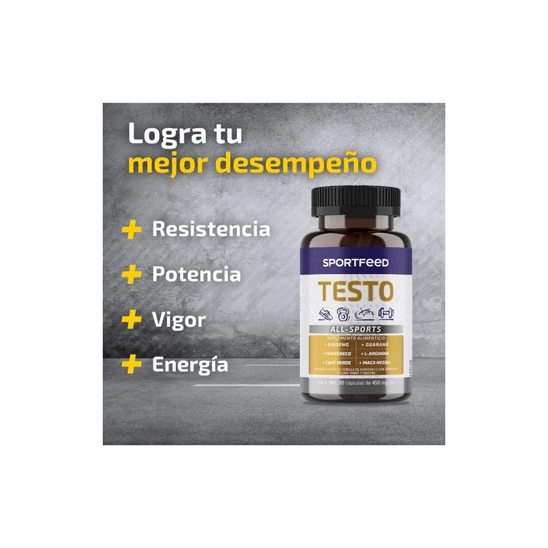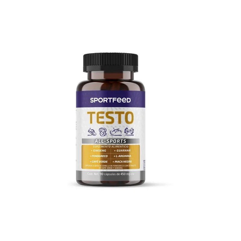 Sportfeed Testo es un suplemento alimenticio compuesto por ingredientes como L-Arginina, Maca, Fenogreco entre otros. Está disponible en presentación de 90 cápsulas de 450 mg cada una.