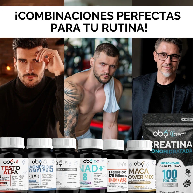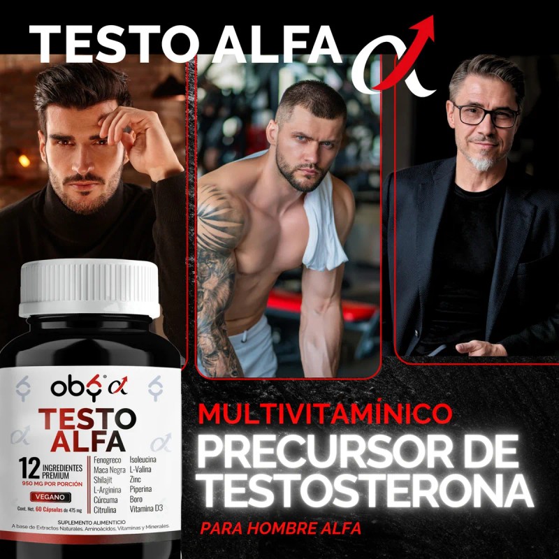 OBY TESTO ALFA | Multivitamínico para Hombre con 12 Ingredientes Premium Fórmula avanzada diseñada para el hombre alfa, con una potente combinación de 12 ingredientes clave de última generación: Fenogreco, Cúrcuma, L-Arginina, Citrulina, Maca Negra, Shilajit, Isoleucina, L-Valina, Zinc, Piperina, Boro y Vitamina D3. Ideal para mejorar tu rendimiento físico, vitalidad diaria y bienestar general. - ALTA POTENCIA: 12 ingredientes clave de última generación. - 100% VEGANO: Sin gluten, lactosa, azúcares ni colorantes artificiales. - PORCIÓN de 950mg por cápsula. - DOSIS SUGERIDA: 2 cápsulas al día con tus alimentos. 60 cápsulas. - SÉGURIDAD: Sello hermético y tapa de seguridad para mantener la frescura. Beneficios clave: 1. Fenogreco: Mejora la fuerza y equilibra los niveles hormonales. Maca Negra: Aumenta la vitalidad y el rendimiento físico. Shilajit: Apoya la recuperación muscular y la salud celular. L Arginina & Citrulina: Mejoran la circulación y reducen la fatiga. Cúrcuma: Propiedades antioxidantes y antiinflamatorias.