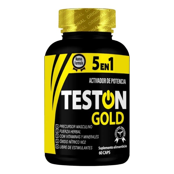 - Teston Gold 60 Cápsulas Fórmula potenciadora natural de la testosterona que promueve el aumento de masa muscular, la fuerza y la resistencia. Además, favorece el bienestar, la energía, la vitalidad y el vigor para rendir físicamente tanto dentro como fuera del gimnasio. ABROJO DE FLOR AMARILLA Ejerce su función natural sobre la testosterona y la libido, al incrementar naturalmente la testosterona, se fomenta la masa muscular, así como también actúa sobre el estado de ánimo, disminuye el peso de forma rápida, ayuda a conseguir un sueño reparador, protege el sistema cardiovascular y se utiliza para evitar los dolores musculares crónicos. MACA NEGRA Funciona como reconstituyente energético gracias a la cantidad de vitaminas anteriormente mencionadas. Combate la falta de energía, por ejemplo, mejora la resistencia física y mental, de ahí que sea muy utilizada por deportistas. La maca es un tónico nervioso natural muy efectivo. Sin llegar a ser un fuerte relajante o un sedante en sí, facilita la relajación y ayuda a reducir los niveles de estrés, por lo que regula los nervios. Otros beneficios: vigorizante, mejora la fertilidad, mejora la concentración. HMB Ayuda a nuestro cuerpo a preservar las células musculares, promoviendo el crecimiento muscular y fomentando su recuperación después del ejercicio. El HMB aumenta el consumo máximo de oxígeno y mejora el punto de compensación respiratoria (RCP). Esto se traduce en la mejora en el rendimiento aeróbico, fundamental para atletas de resistencia. ZMA Es un complejo vitamínico de Zinc, Magnesio y Vitamina B6, que diversos estudios atribuyen al buen estado hormonal y del sistema inmunológico, propiciando una liberación mayor de testosterona, misma que ayuda a mantener la masa muscular magra. ARGININA Se le atribuye la propiedad de mejorar el rendimiento físico, debido a su capacidad como precursor de Óxido Nítrico un potente vasodilatador que forma parte de nuestro cuerpo, en respuesta a esto las arterias del músculo esquelético se vaso dilatan para aumentar el transporte de nutrientes y oxígeno a los músculos durante la actividad física. Al existir una mejor captación de nutrientes y oxigeno debido a la vasodilatación, el musculo se ve beneficiado en una mejor recuperación y rendimiento físico durante la actividad. Modo de empleo: consumir una porción (2 cápsulas) 30 minutos antes del entrenamiento. Para más información consulte a su médico.