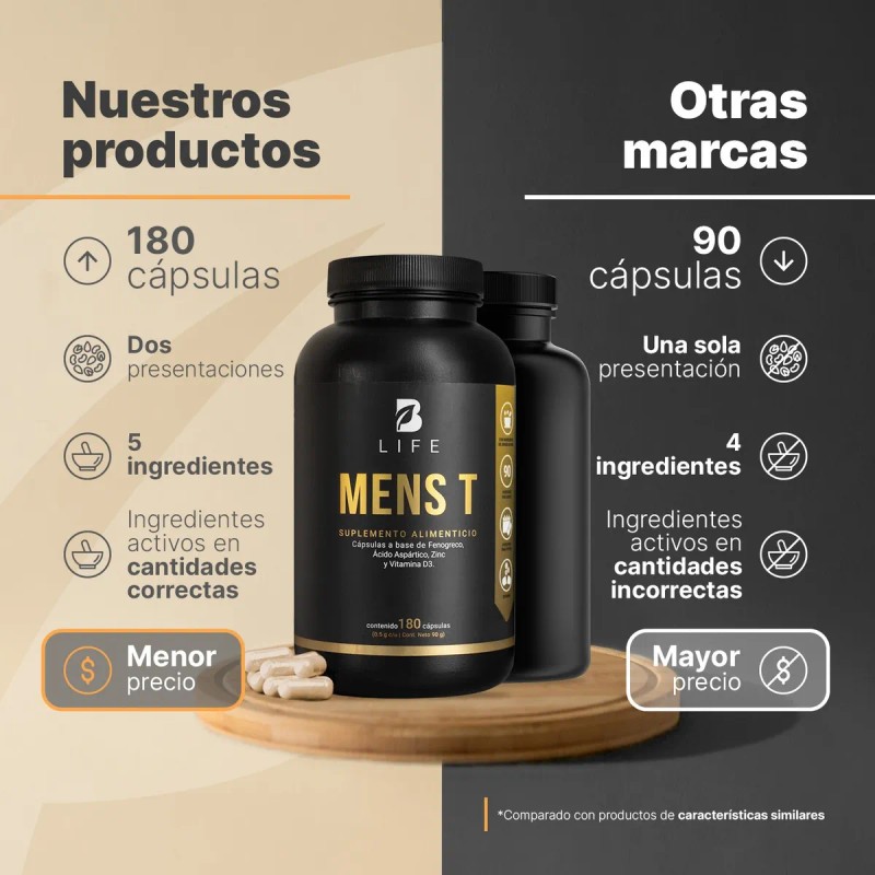Mens Testo de B Life es un suplemento alimenticio de uso deportivo, formulado para potenciar el desempeño físico, la vitalidad y la energía masculina. Su exclusiva fórmula combina potentes activos naturales como Fenogreco, Ácido Aspártico, Arginina, Zinc y Vitamina D3, cuidadosamente seleccionados para apoyar funciones clave del organismo masculino.