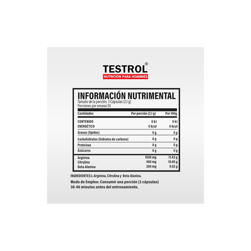 Testrol Arginina Platinum 2100 mg Suplemento para el Rendimiento Fsico con Citrulina, Beta-Alanina y Arginina 90 Cpsulas